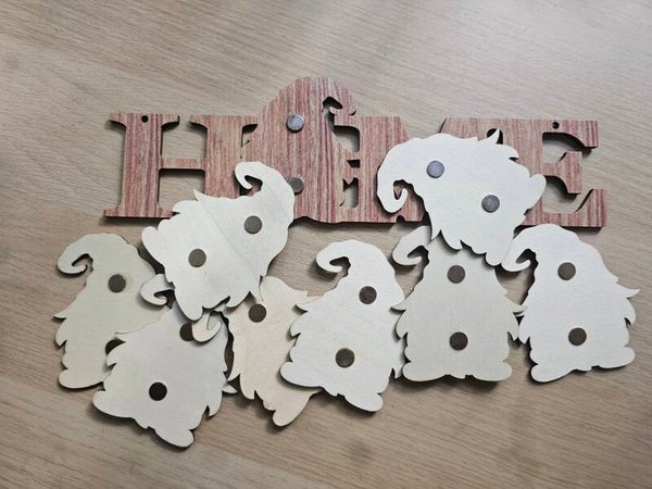 Holzschild "HOME", wo das "O" ein Gnom darstellt. Dazu kommen 8 Gnome, die verschiedene Jahreszeiten bzw. Feiertage darstellen.