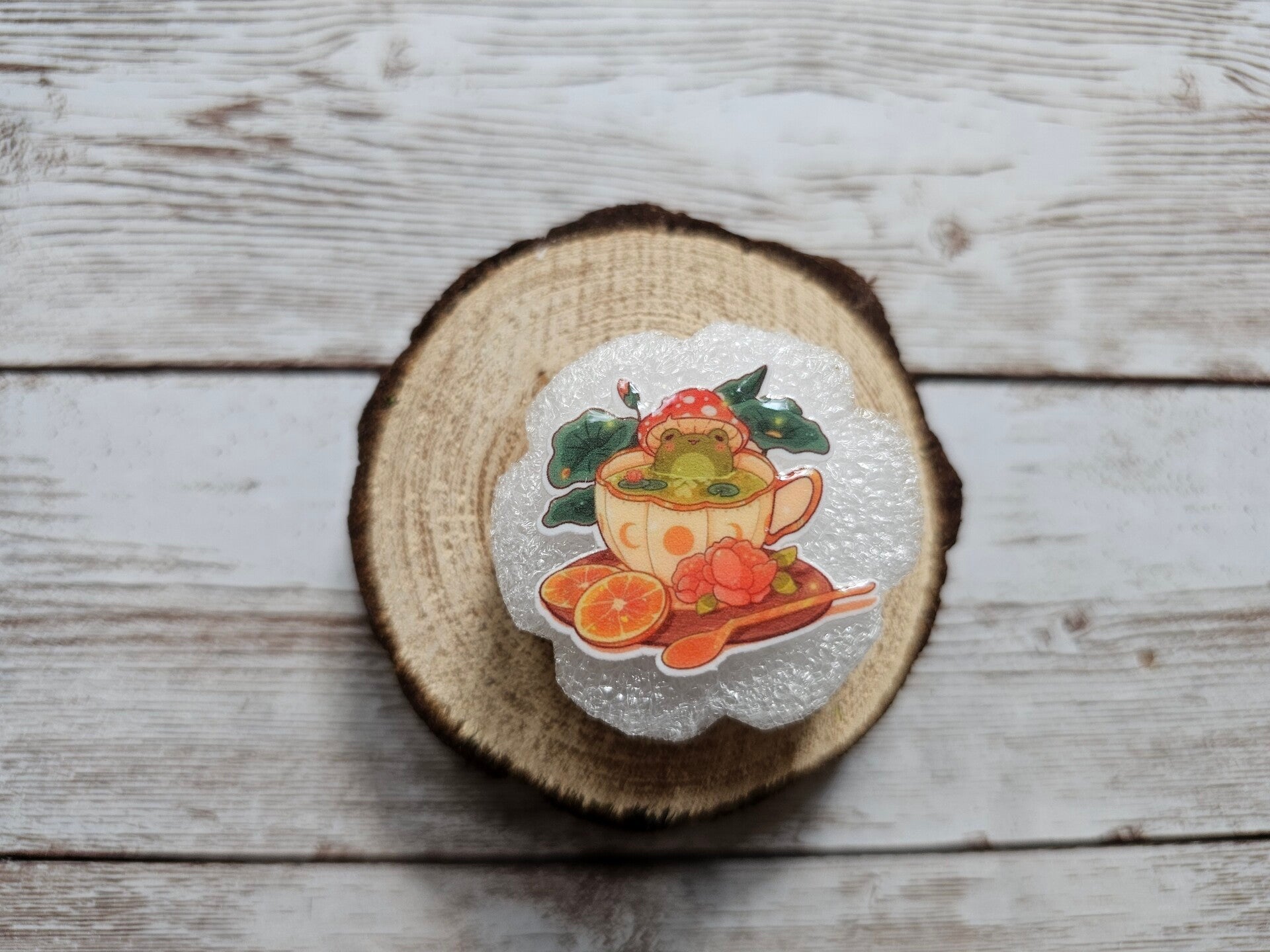 Ein Fliegenpilzhutfrosch sitzt im Herbsttee - einfach trollig.