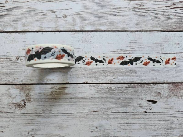 Washi Tape in weiß mit Fledermäusen und Laubblättern.,
