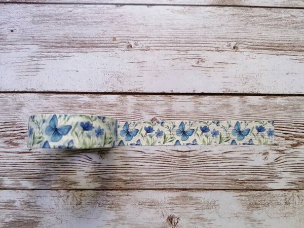 Washi Tape mit ganz hellblauem Hintergrund, mit blauen Schmetterlingen und rosanen Blümchen verziert.
